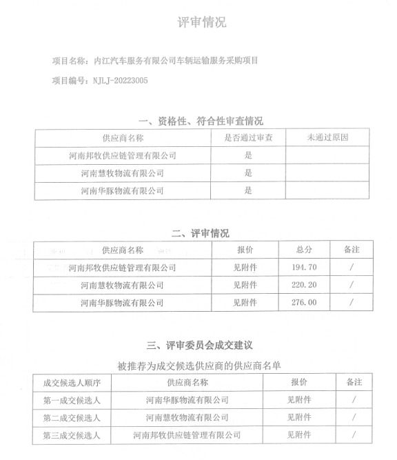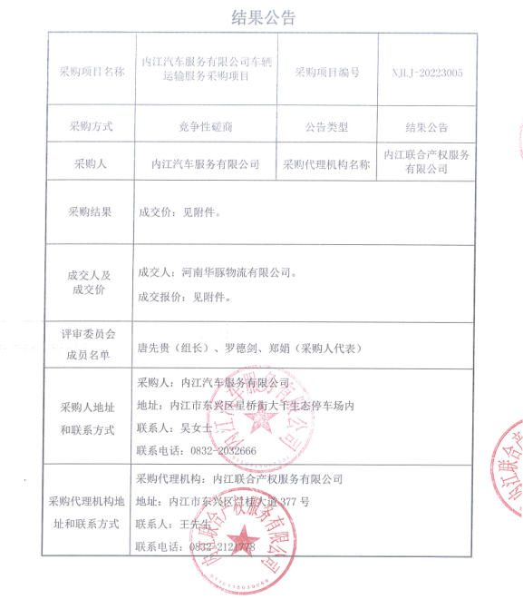 内江汽车服务有限公司车辆运输服务采购项目结果公告