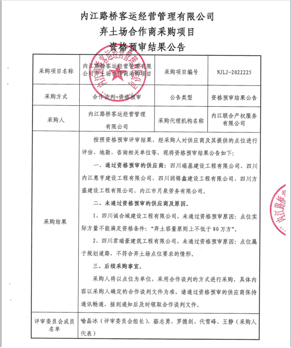 内江路桥客运经营管理有限公司弃土场合作商采购项目资格预审结果公告