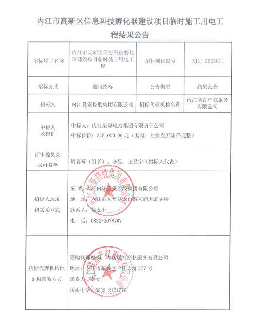 内江市高新区信息科技孵化器建设项目临时施工用电工程结果公告