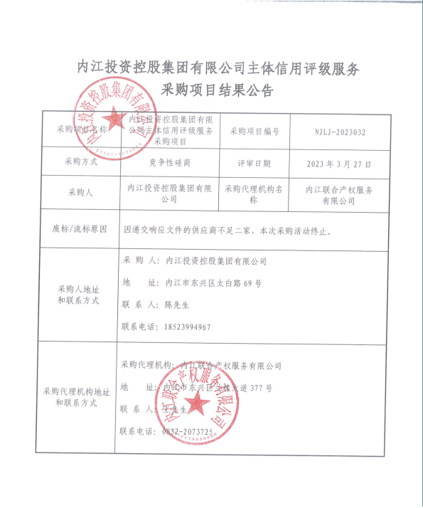 内江投资控股集团有限公司主体信用评级服务采购项目结果公告