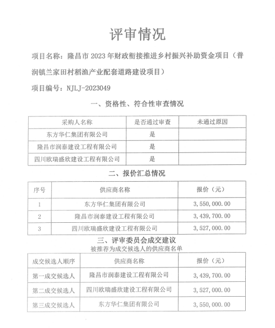 隆昌市2023年财政衔接推进乡村振兴补助资金项目(普润镇兰家田村稻渔产业配套道路建设项目)结果公告