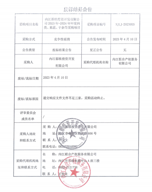 内江蓉欧投资开发有限公司2023年-2024年年度肉类、果蔬、干杂等采购项目废标结果公告