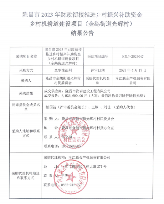 隆昌市2023年财政衔接推进乡村振兴补助资金乡村机耕道建设项目(金鹅街道光辉村)结果公告