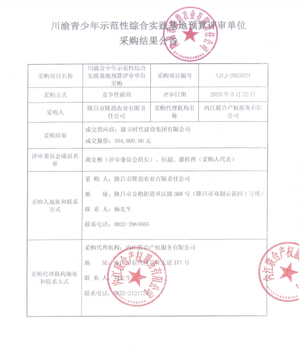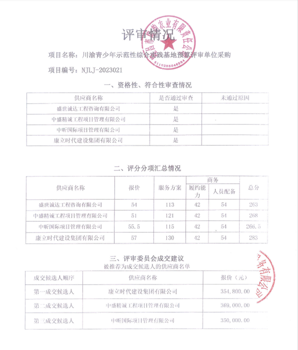川渝青少年示范性综合实践基地预算评审单位采购结果公告