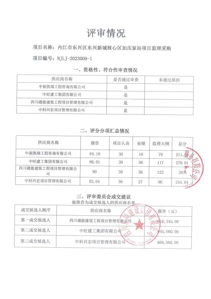 内江市东兴区东兴新城核心区加压泵站项目监理采购结果公告