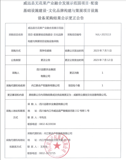 威远县无花果产业融合发展示范园项目-配套基础设施建设-文化品牌构建与策展项目设施设备采购结果公示更正公告