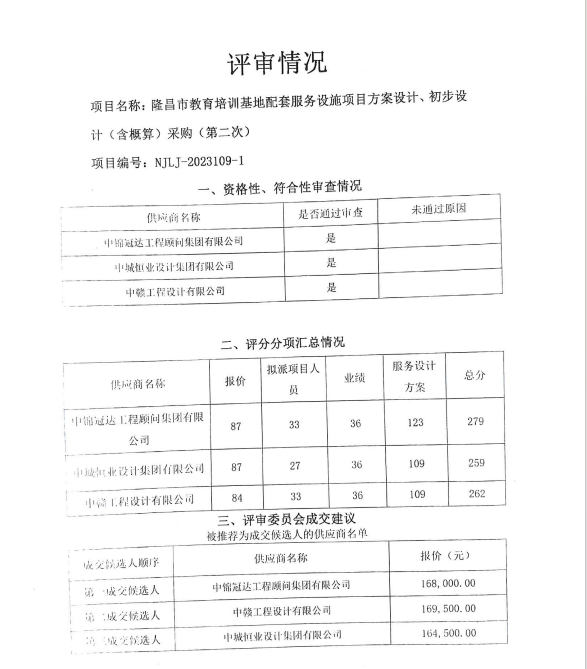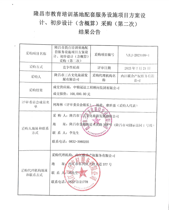隆昌市教育培训基地配套服务设施项目方案设计、初步设计(含概算)采购(第二次)结果公告