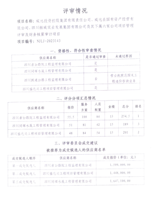 威远投资控股集团有限责任公司、威远县国有资产经营有限公司、四川振威实业发展集团有限公司及其下属六家公司项目管理评审及财务核算审计项目结果公告