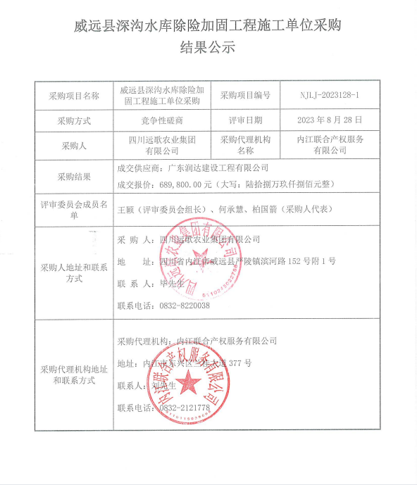 威远县深沟水库除险加固工程施工单位采购结果公示