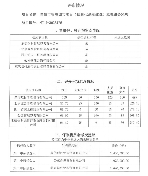 隆昌市智慧城市项目(信息化系统建设)监理服务采购结果公告