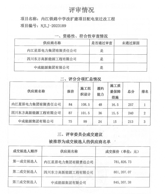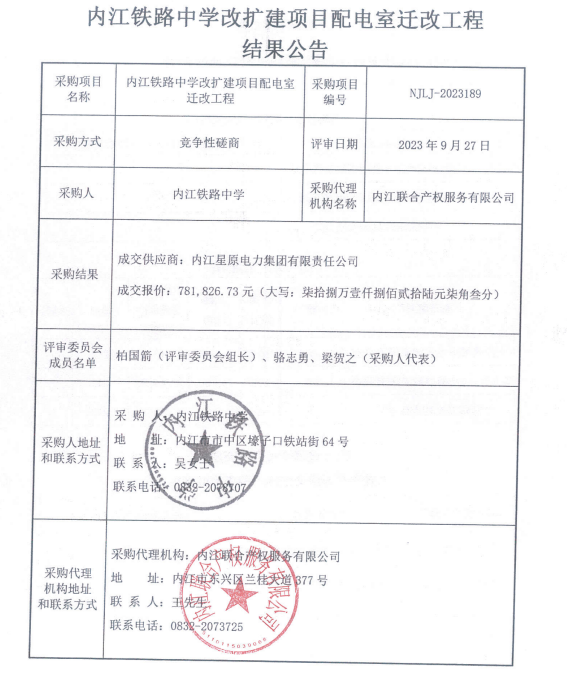 内江铁路中学改扩建项目配电室迁改工程结果公告