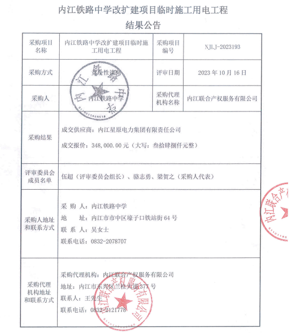 内江铁路中学改扩建项目临时施工用电工程结果公告
