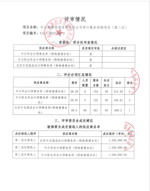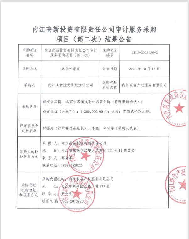 内江高新投资有限责任公司审计服务采购项目(第二次)结果公告