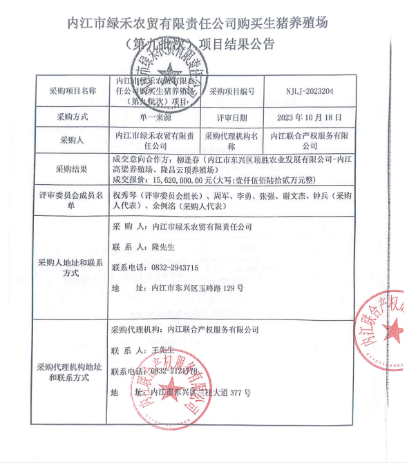 内江市绿禾农贸有限责任公司购买生猪养殖场(第九批次)项目结果公告