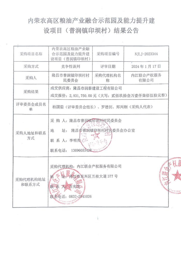 内荣农高区粮油产业融合示范园及能力提升建设项目(普润镇印坝村)结果公告