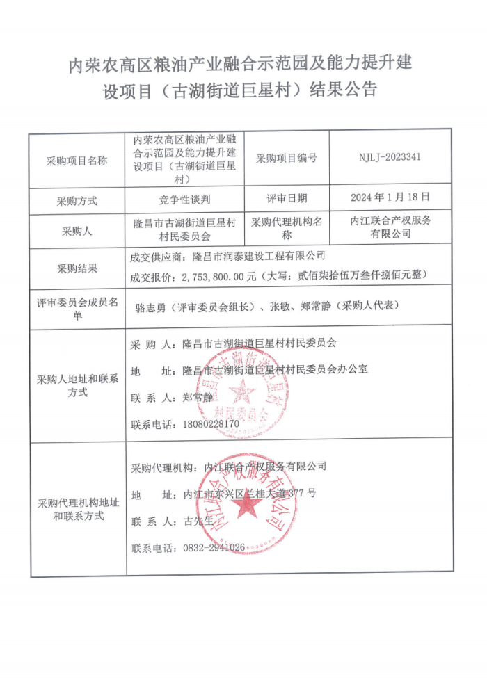 内荣农高区粮油产业融合示范园及能力提升建设项目(古湖街道巨星村)结果公告