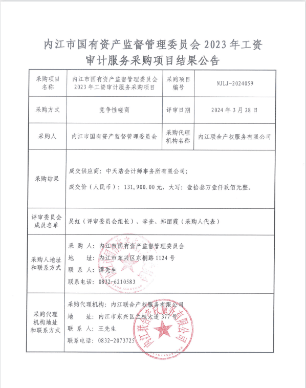 内江市国有资产监督管理委员会2023年工资审计服务采购项目结果公告