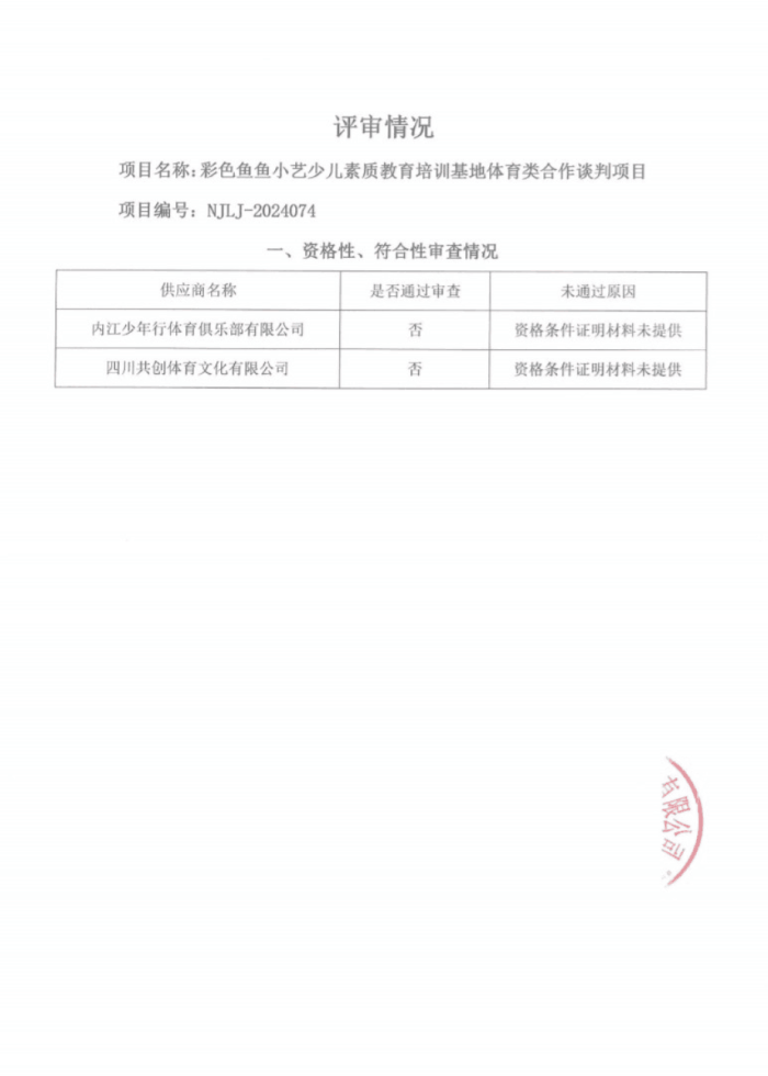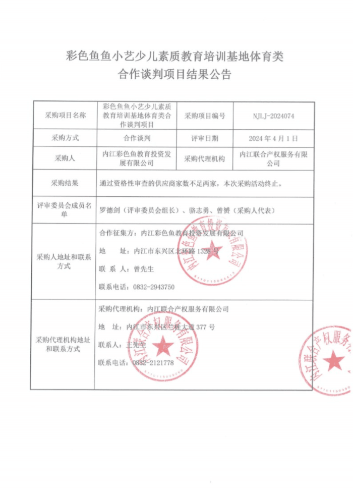 彩色鱼鱼小艺少儿素质教育培训基地体育类合作谈判项目(第二次)结果公告