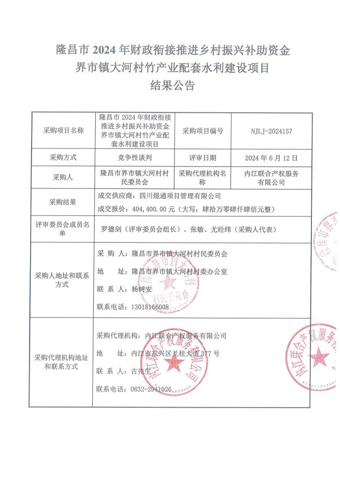 隆昌市2024年财政衔接推进乡村振兴补助资金界市镇大河村竹产业配套水利建设项目结果公告