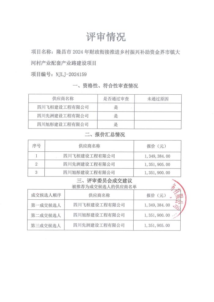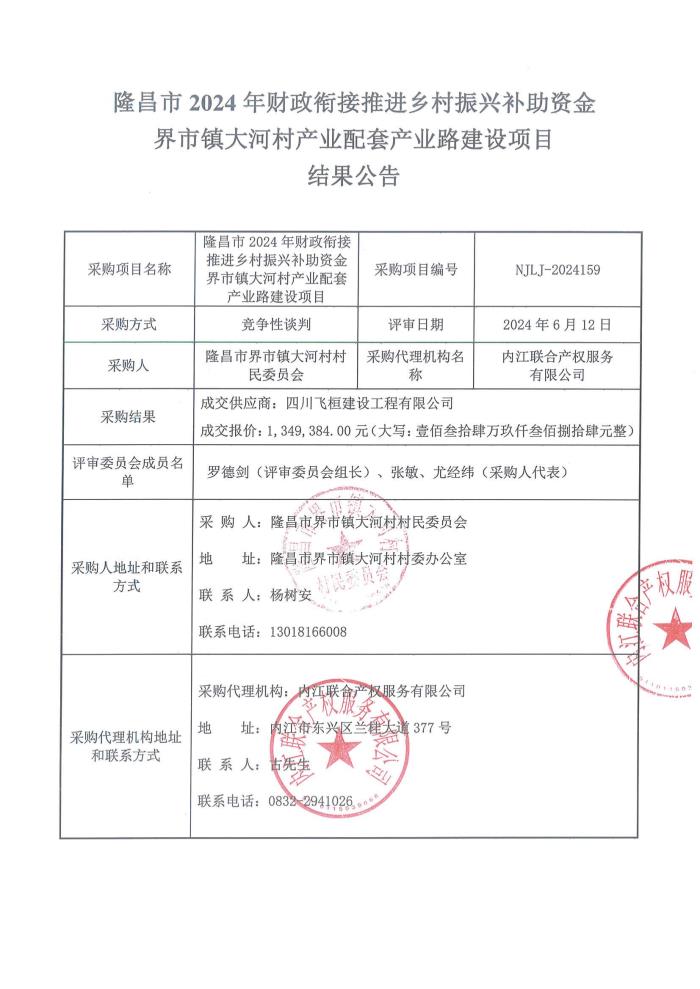 隆昌市2024年财政衔接推进乡村振兴补助资金界市镇大河村产业配套产业路建设项目结果公告