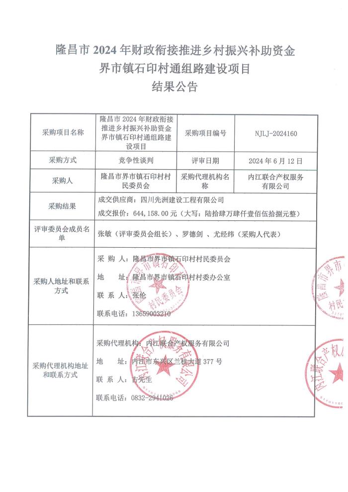 隆昌市2024年财政衔接推进乡村振兴补助资金界市镇石印村通组路建设项目结果公告