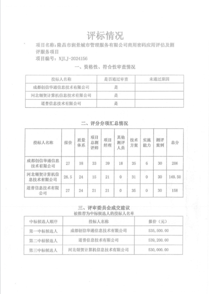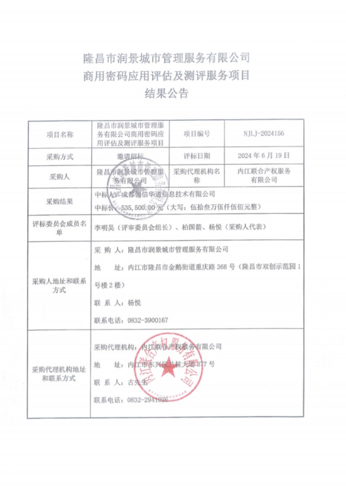 隆昌市润景城市管理服务有限公司商用密码应用评估及测评服务项目结果公告