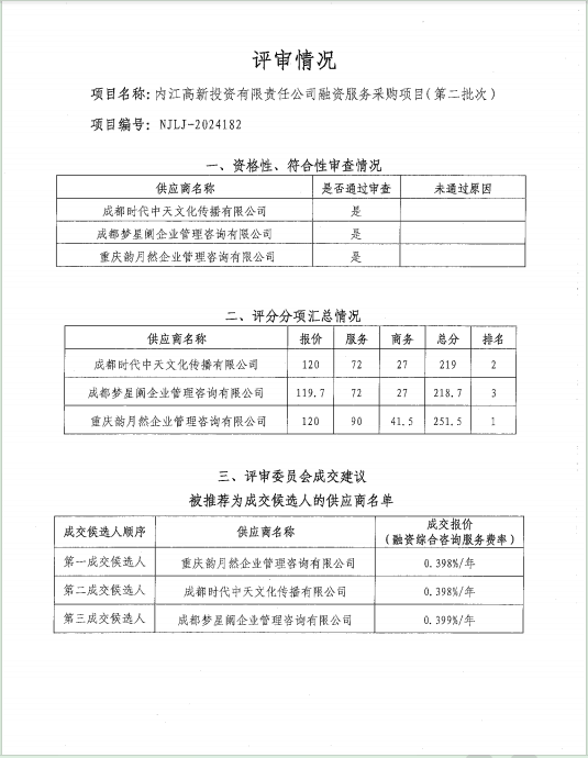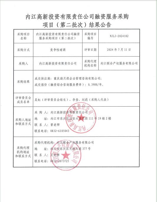 内江高新投资有限责任公司融资服务采购项目(第二批次)结果公告
