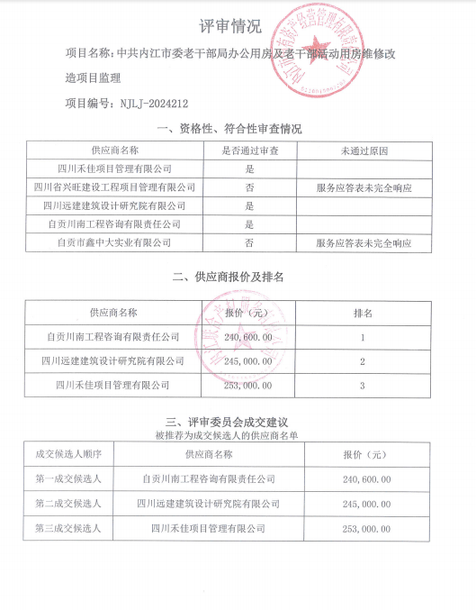 中共内江市委老干部局办公用房及老干部活动用房维修改造项目监理结果公告