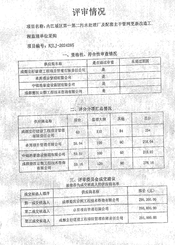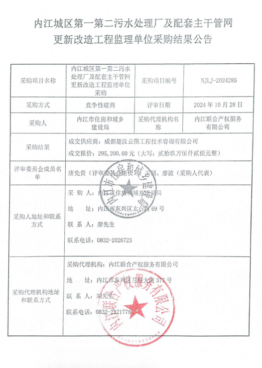 内江城区第一第二污水处理厂及配套主干管网更新改造工程监理单位采购结果公告