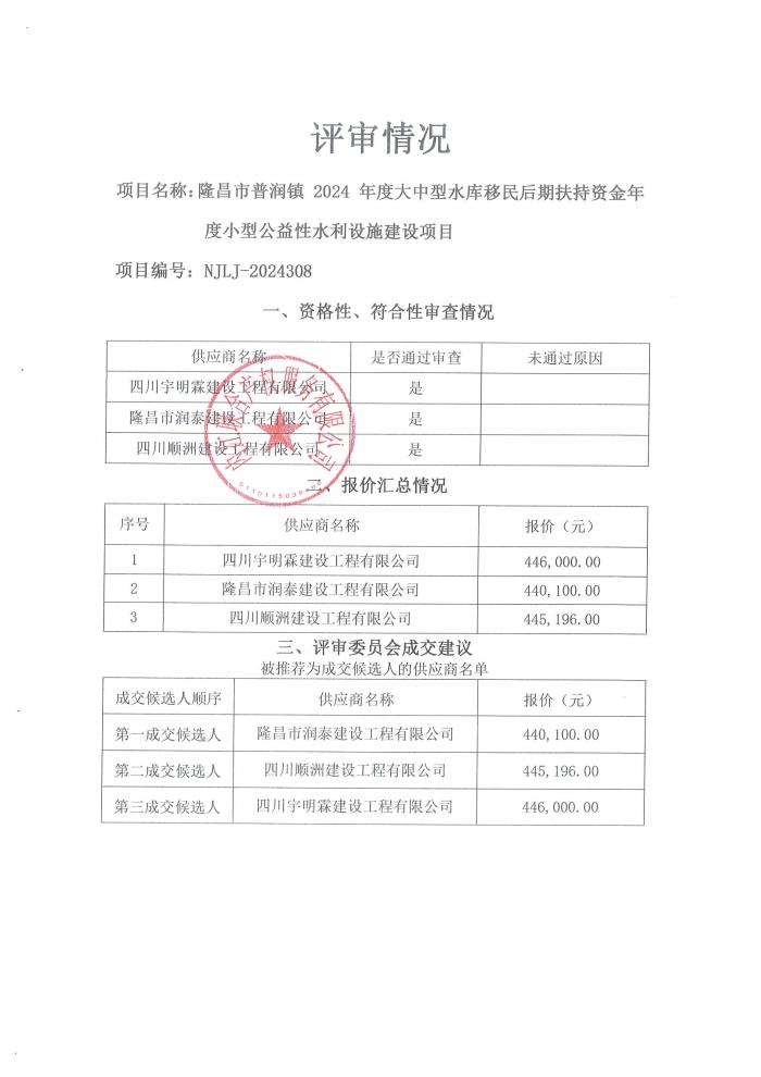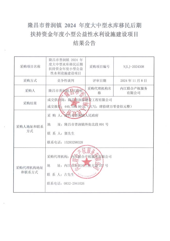 隆昌市普润镇 2024 年度大中型水库移民后期扶持资金年度小型公益性水利设施建设项目结果公告