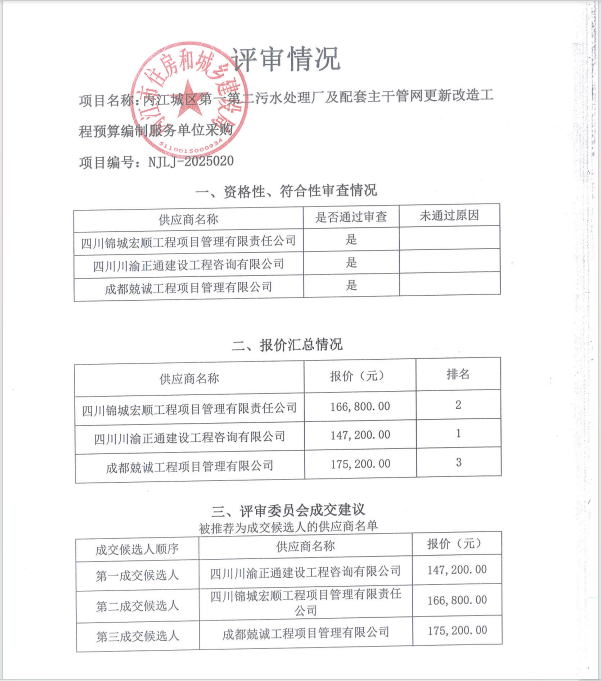 内江城区第一第二污水处理厂及配套主干管网更新改造工程预算编制服务单位采购结果公告