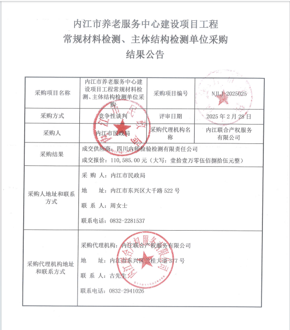 内江市养老服务中心建设项目工程 常规材料检测、主体结构检测单位采购结果公告