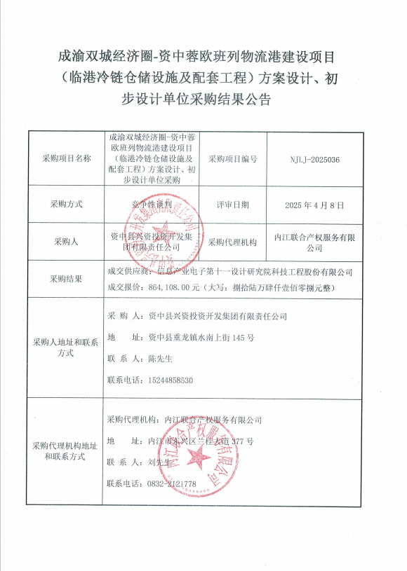 成渝双城经济圈-资中蓉欧班列物流港建设项目(临港冷链仓储设施及配套工程)方案设计、初步设计单位采购结果公告