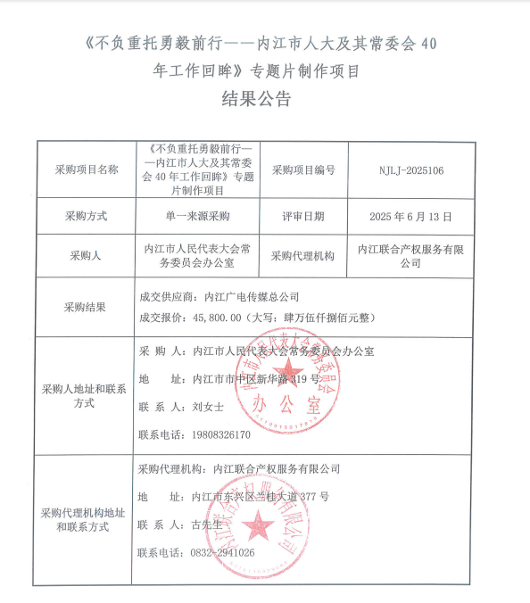 《不负重托勇毅前行——内江市人大及其常委会40年工作回眸》专题片制作项目结果公告