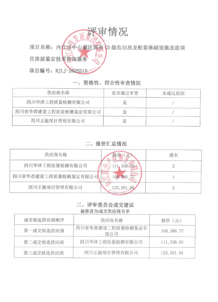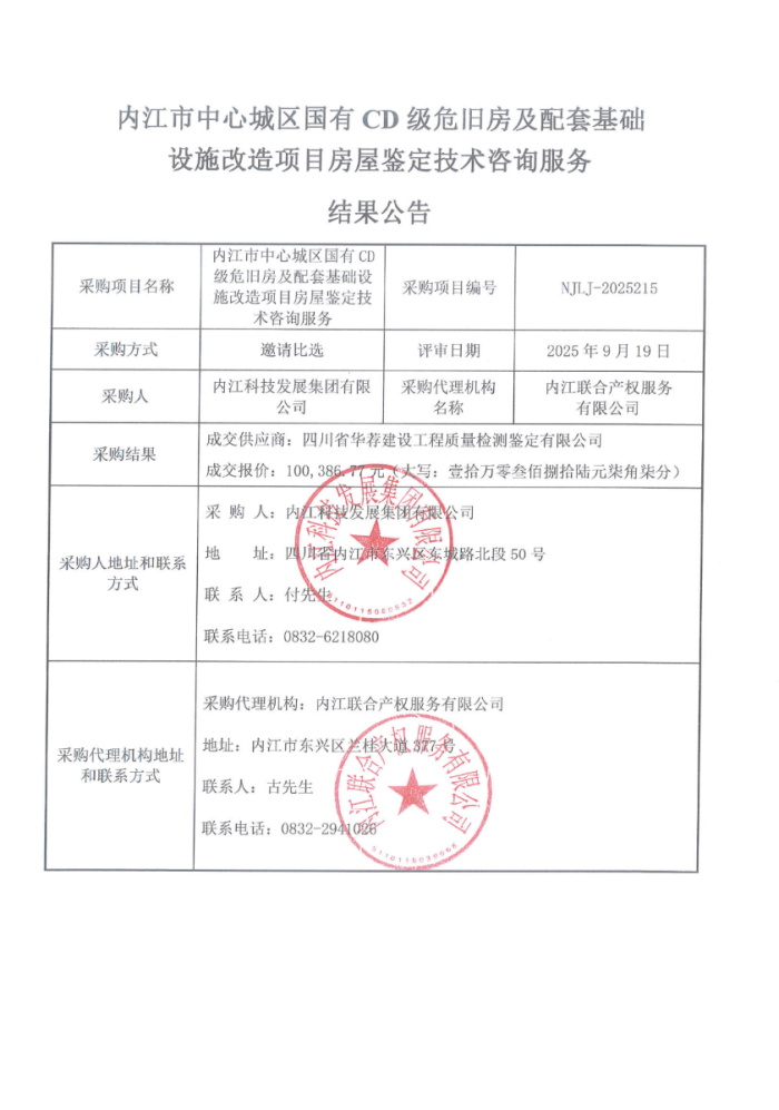 内江市中心城区国有CD级危旧房及配套基础设施改造项目房屋鉴定技术咨询服务结果公告